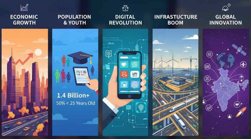 Every January needs a reset narrative: not optimism, not doom—orientation. If you want a clean “India entering 2026” explainer, build it around five visuals that answer five questions.